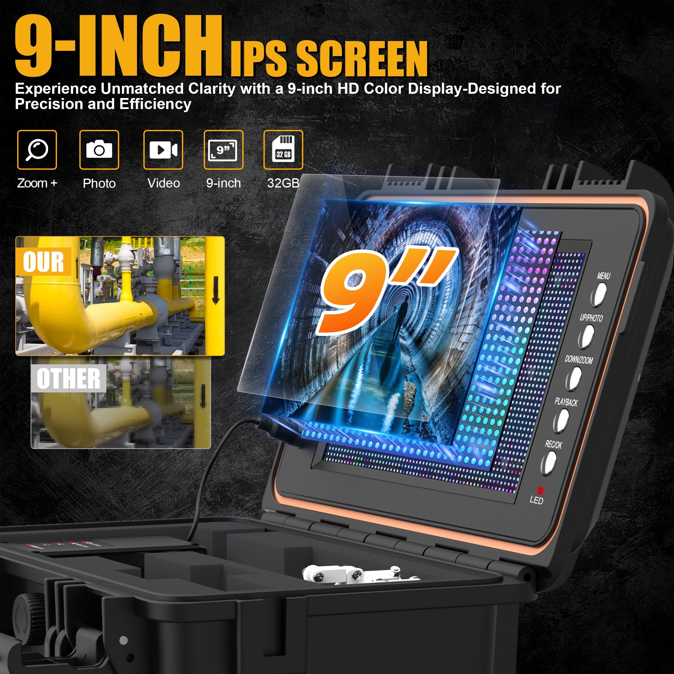Drainpangolin DP09D2 sewer inspection camera combines a bright 9″ IPS display, 512Hz locator, and self-leveling lens to deliver clear and upright pipe footage in any condition. Its 100ft waterproof push cable and 12 dimmable LEDs make it easy to inspect drains, pipes, and sewers of various diameters. Designed for professional plumbers and contractors who need a portable, accurate, and durable pipe inspection system. Perfect for home, commercial, or industrial projects where visibility and efficiency matter.